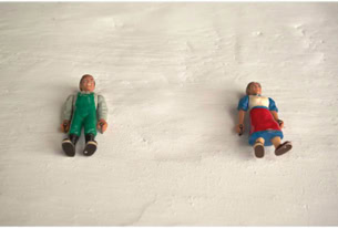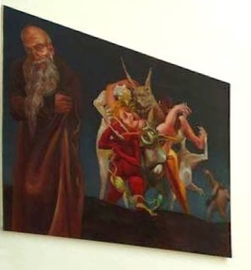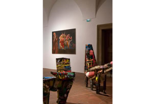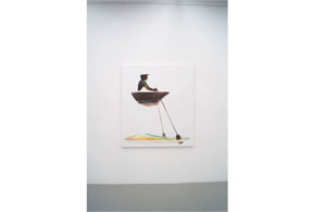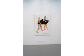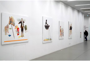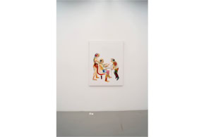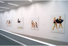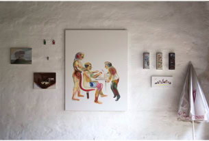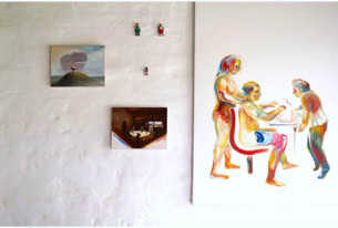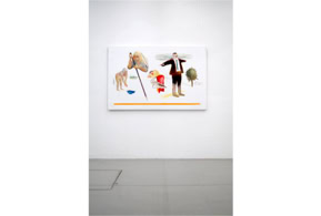 The paintings of Jan Kilian Böttcher are a playful attempt at “traditional” images, with an awareness of their own exaggeration and vanity, returning (often as parody) to postwar neo-realism in terms of their ambiguous sense of engagement, ironically transplanted into the current situation of post-communist Germany. Allusions to classical mythological themes are interspersed with Communist ideology and punk earthiness, only to finally reveal the comics-derived basis of the cycle, with the last image hidden behind the heating unit next to the fire extinguisher. It is a painting that possesses a quality of directness, not as an autotelic attempt, but as a confident and entertaining narrative.