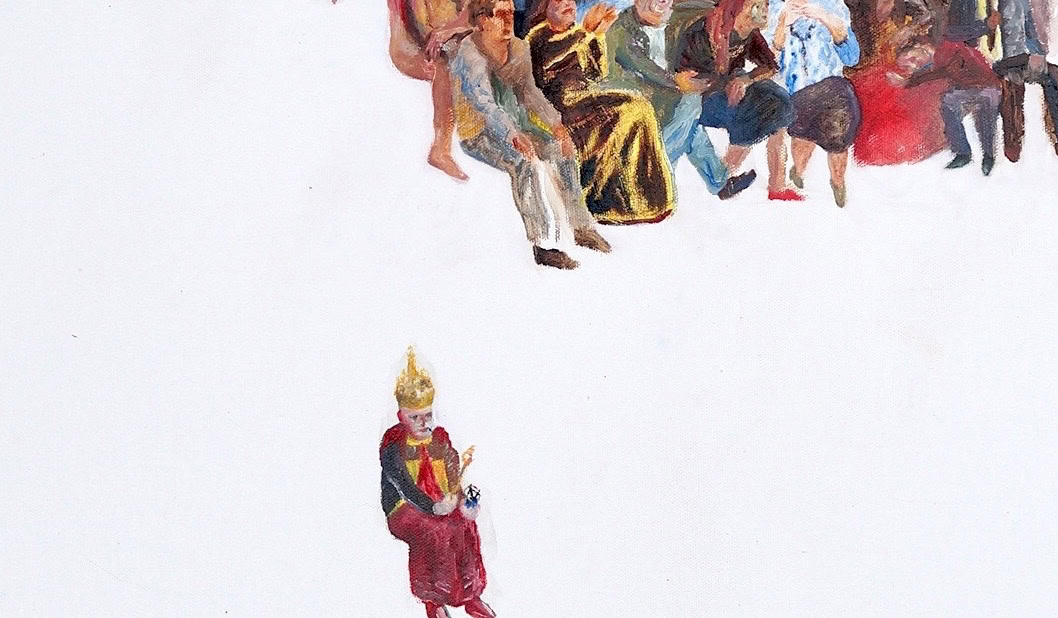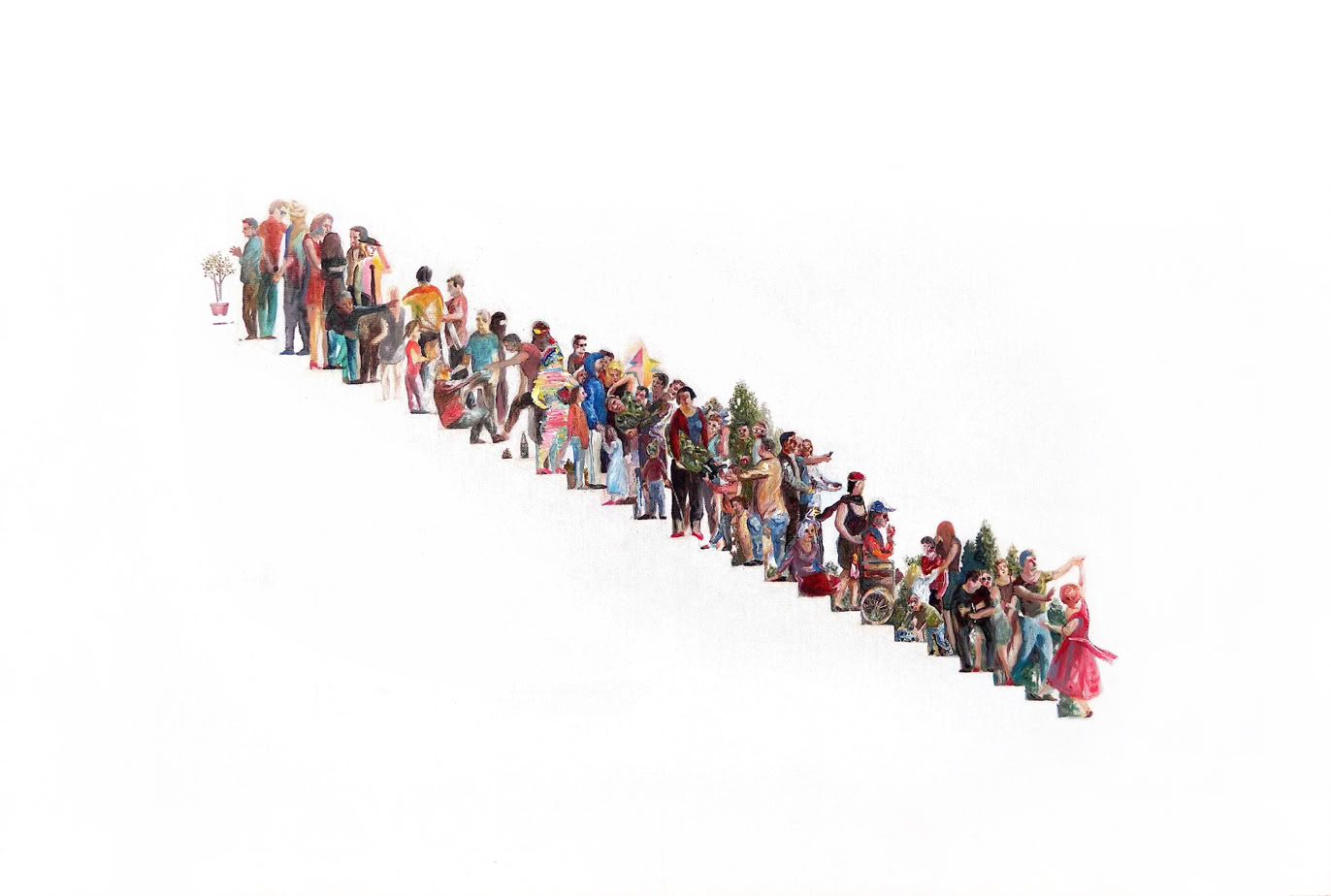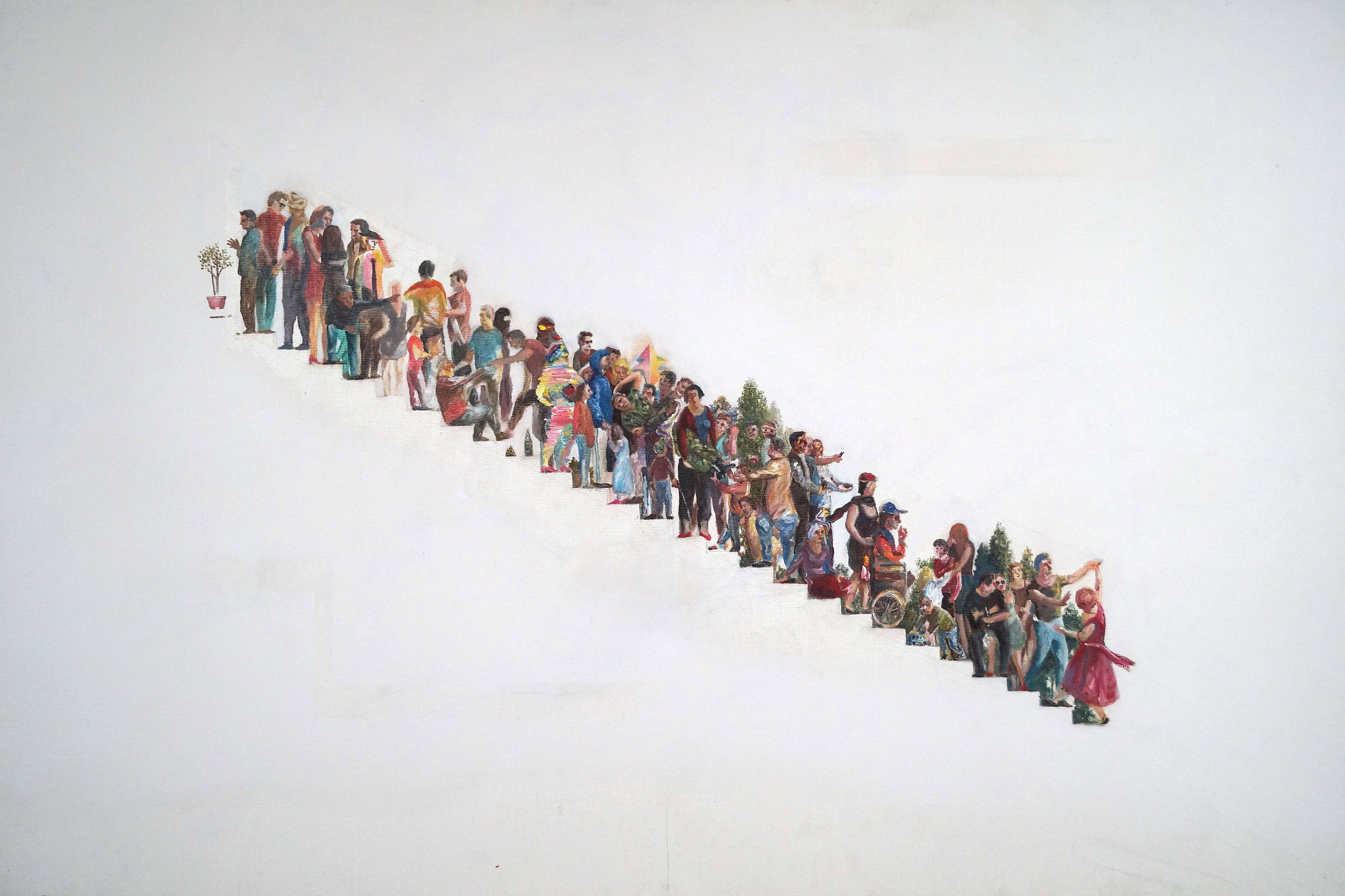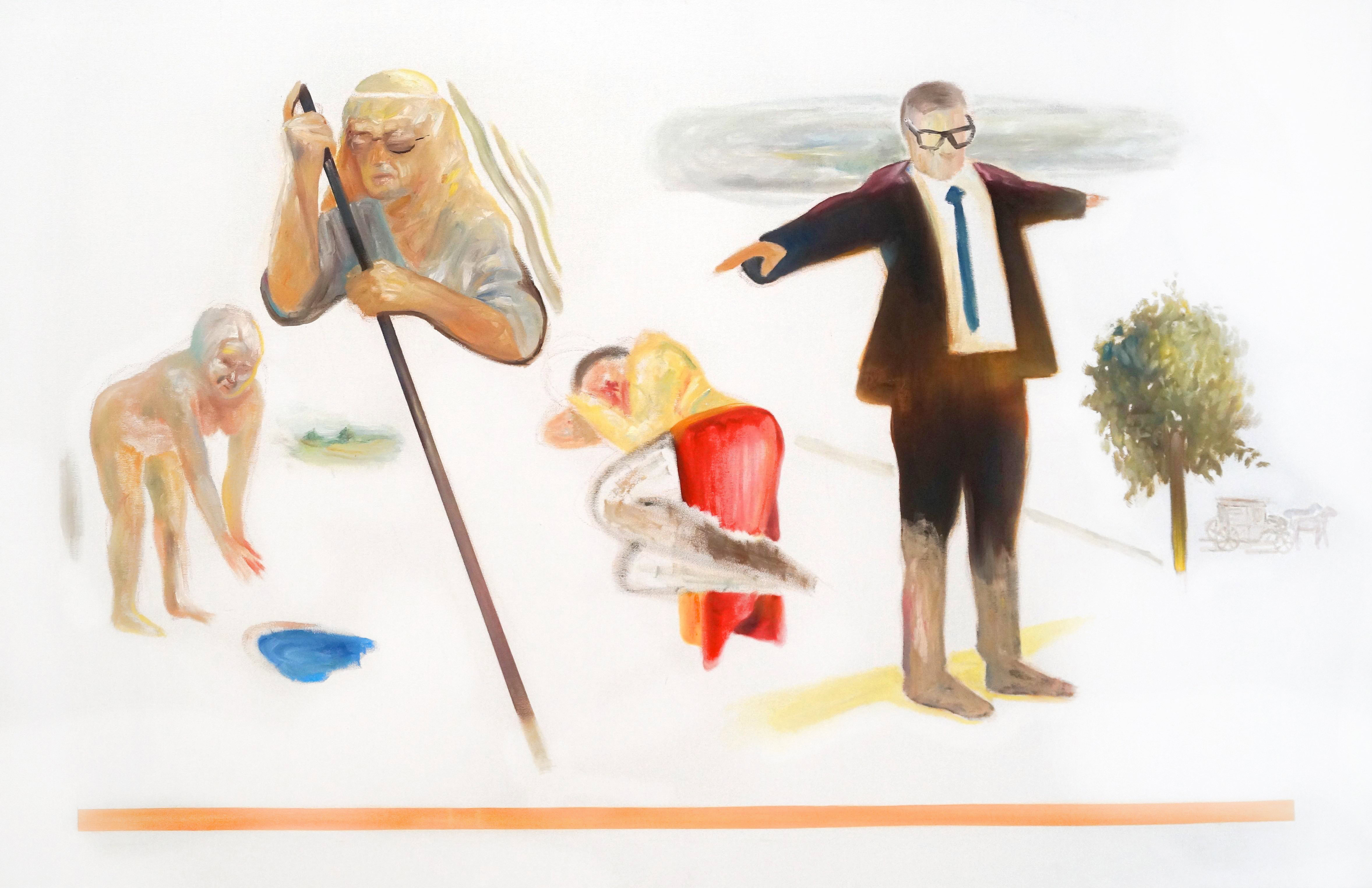 The series White Rooms consists of works that spontaneously depict figurative juxtapositions and works preceded by extensive research, including societal structures. The research-related works comprise numerous scenes of exemplary individual images, depicting various scenarios without claiming objectivity.