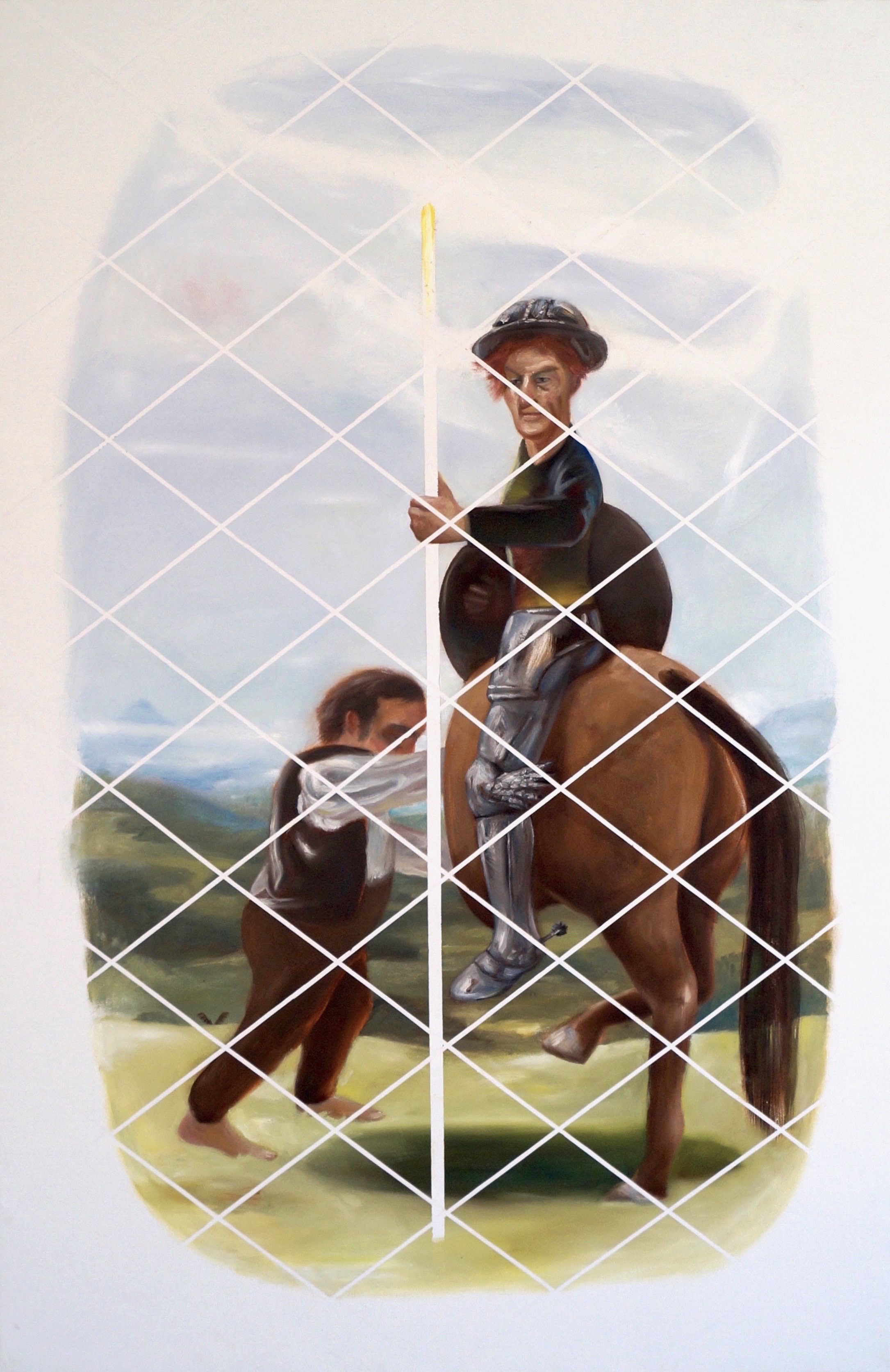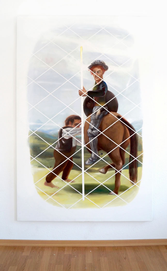Behind the grids, the white surface of the canvas emerges, and the original image recedes. The motif undergoes destruction and simultaneous rearrangement. The grids resemble the curtain in classical painting, providing a second frame for an image. The subject is delineated, emphasized, and simultaneously fragmented.
