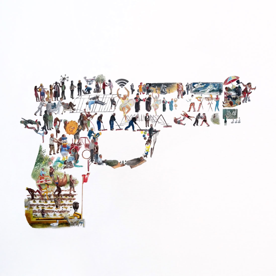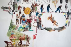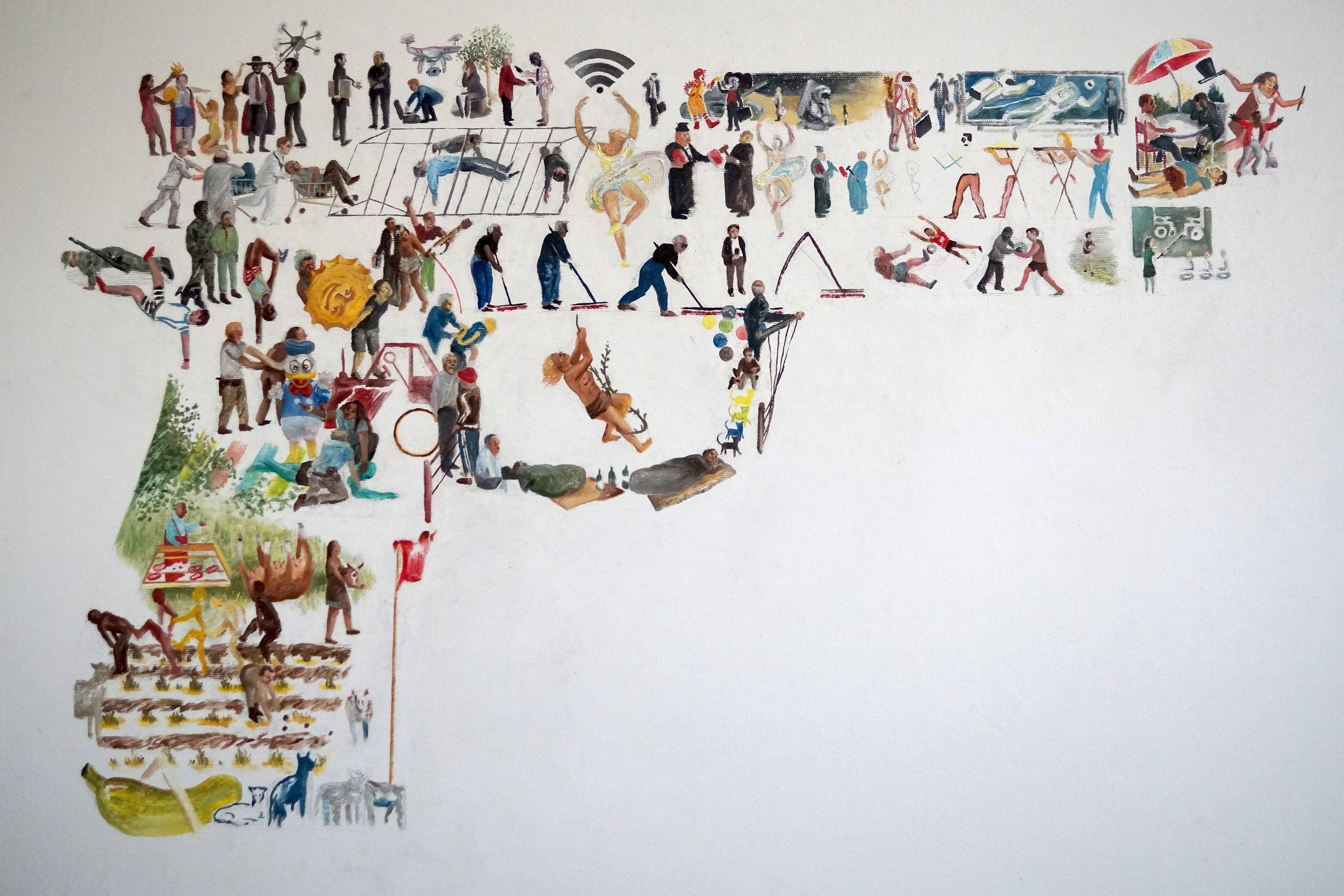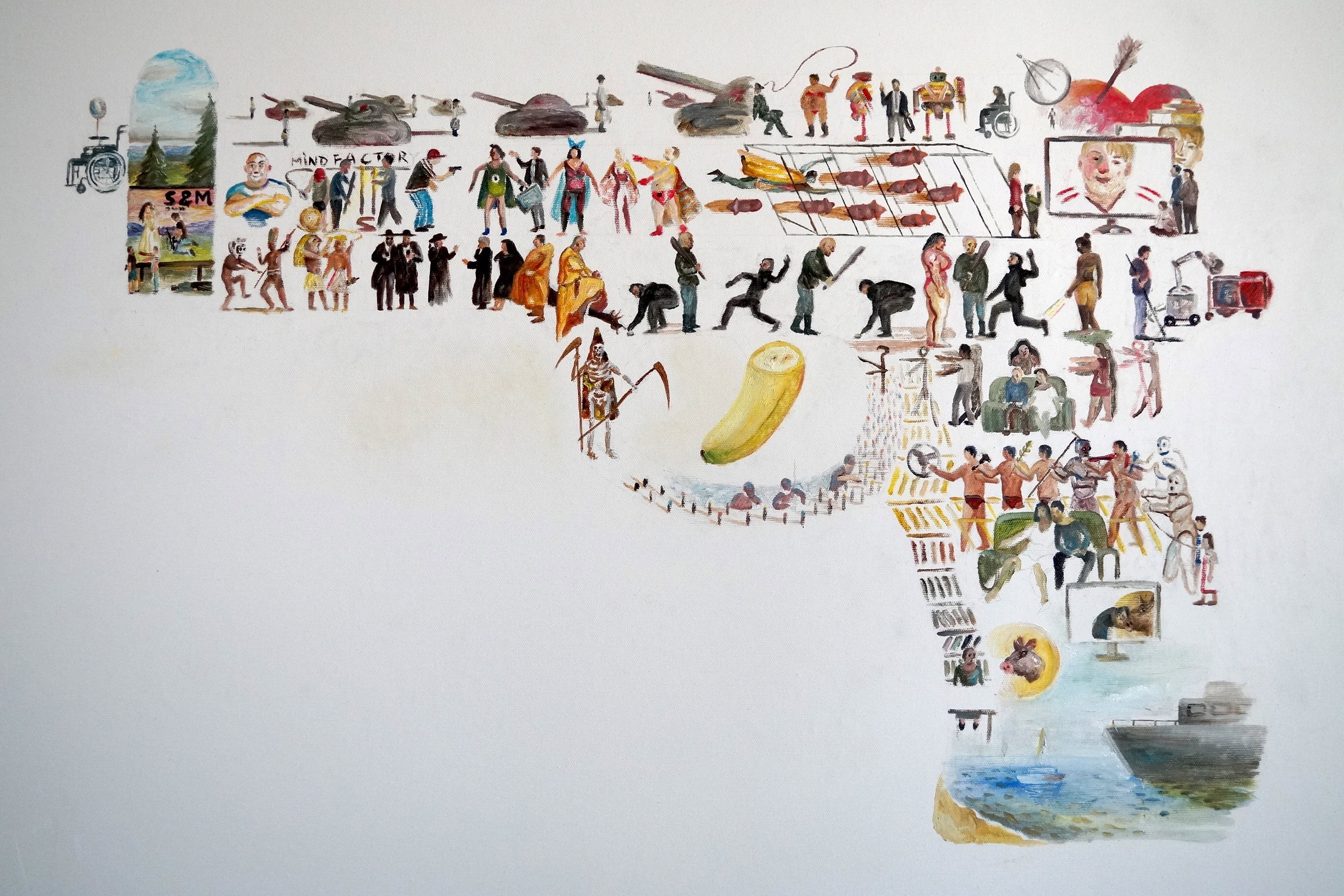 I utilize enumerations, repetitions, confusion, and juxtapositions, image writings like hieroglyphs, textbook and comic illustrations, classical and modern techniques, drawing, and applied graphics.