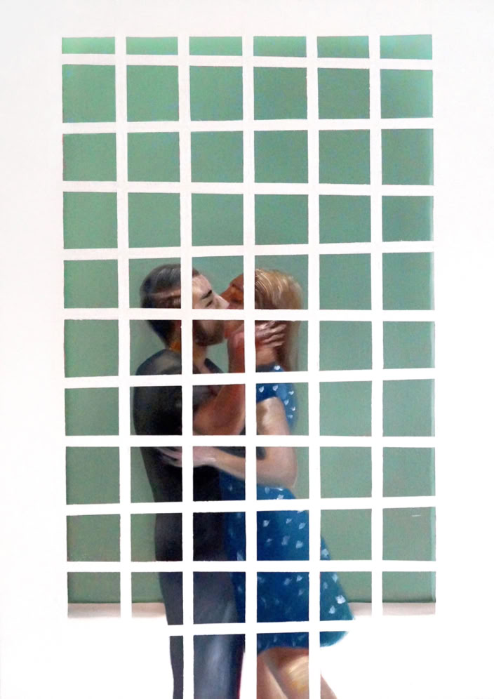 Hinter den Rastern tritt die weiße Fläche der Leinwand hervor und das ursprüngliche Bild zurück. Das Motiv erfährt eine Zerstörung und gleichzeitige Neuanordnung.